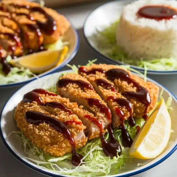 Create a bed of finely shredded green cabbage on each plate. Slice the Chicken Katsu into strips, arrange on top of the cabbage, and drizzle with the Tonkatsu sauce. Serve with steamed rice and a wedge of lemon on the side.