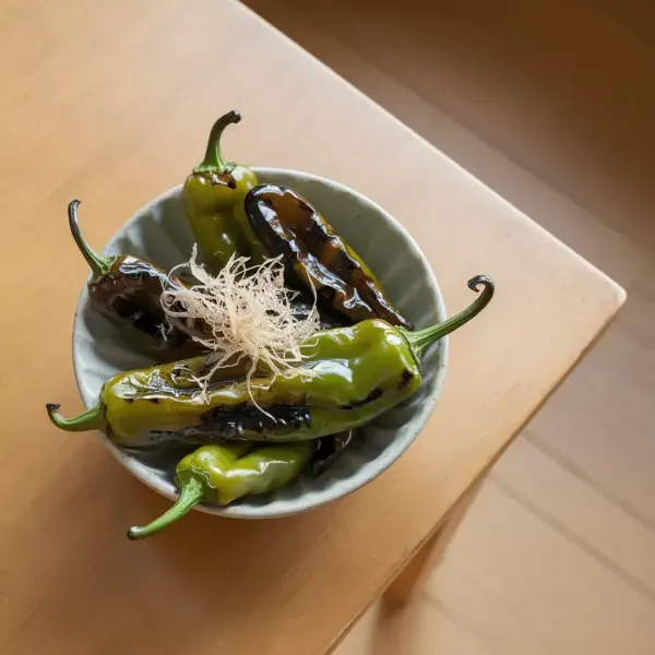 A quick and delightful dish featuring blistered shishito peppers with savory soy sauce and katsuobushi flakes.