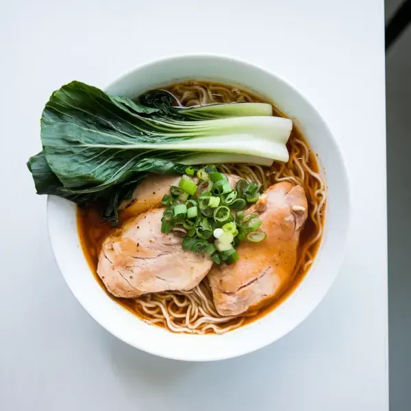A comforting and savory chicken ramen bowl made with miso, chicken, bok choy, and other flavorful ingredients, all prepared in a pressure cooker.