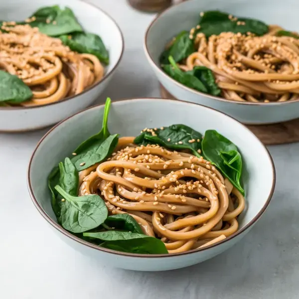 A quick and tasty dish featuring udon noodles coated in a nutty sesame-brown butter sauce with wilted spinach.