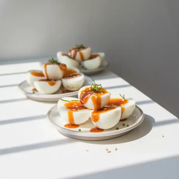 To finish, spoon the prepared sauce over the halved eggs. Garnish with toasted sesame seeds and a sprinkle of minced fresh chives.