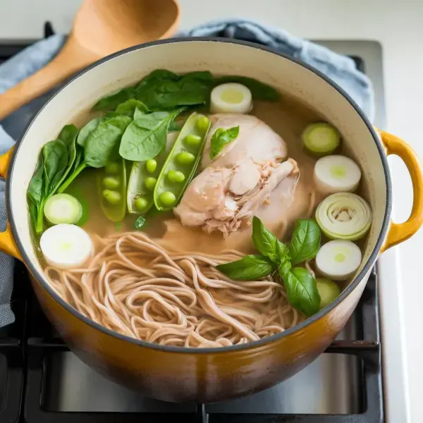 Place a portion of the rinsed soba noodles into each bowl. Ladle the hot soup over the noodles, making sure to distribute chicken, vegetables, and broth evenly. Finish by sprinkling julienned basil leaves on top.
