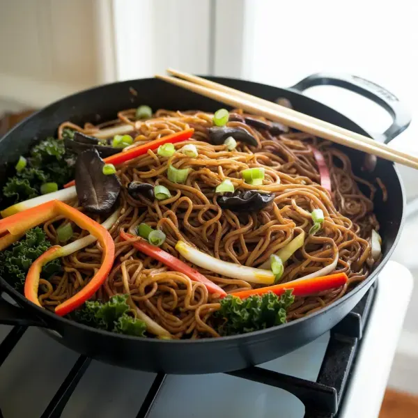 Heat a tablespoon of vegetable oil in a large, high-sided nonstick skillet. Add the thawed and rinsed yakisoba noodles to the skillet and cook until golden and crispy.