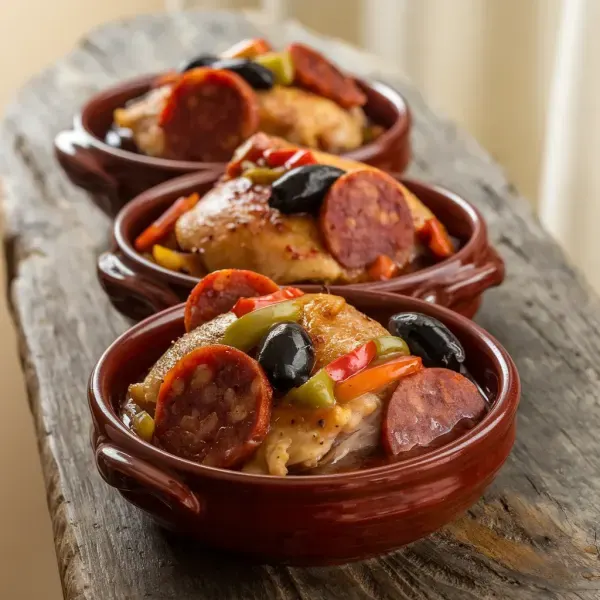 Indulge in the rich flavors of the Mediterranean with this luscious chicken stew, brimming with the bold tastes of chorizo, olives, and peppers. Slow-cooked to perfection, each bite promises tender chicken that effortlessly falls from the bone, ready to be savored with a side of crusty bread to soak up the delightful sauce.