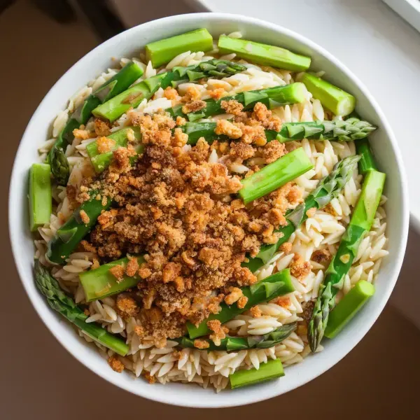 A fresh and vibrant orzo dish with asparagus, lemon, and topped with crispy garlic-Parmesan crumbs.