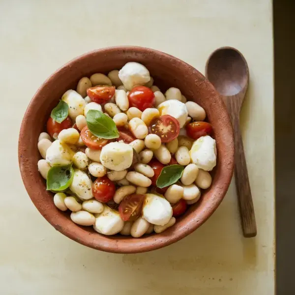 A fresh and vibrant salad featuring white beans, tomatoes, mozzarella, and basil, perfect for a quick and healthy meal.