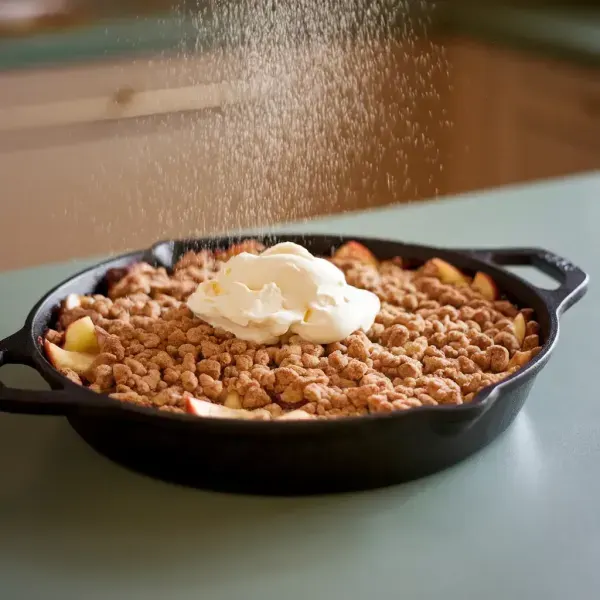 Sprinkle the prepared crumble topping evenly over the apple mixture in the skillet. Place the skillet on the prepared baking sheet and bake in the preheated oven for 15 to 20 minutes, or until the fruit is tender and the topping is deep golden brown. Rotating the skillet halfway through baking can help ensure even browning.