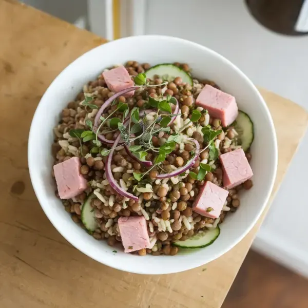 15 minutesA refreshing and hearty salad featuring lentils, rice, ham, cucumber, and a zesty chipotle dressing.