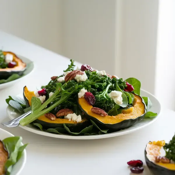 45 minutesA vibrant and hearty salad featuring roasted acorn squash and broccoli rabe, complemented by the saltiness of ricotta salata, the crunch of toasted pecans, and the sweetness of dried cranberries.
