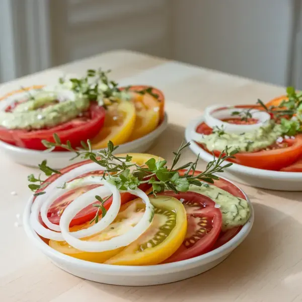 15 minutesA refreshing and creamy salad featuring ripe avocado ranch dressing over heirloom tomatoes and onions, garnished with fresh herbs and flake salt.