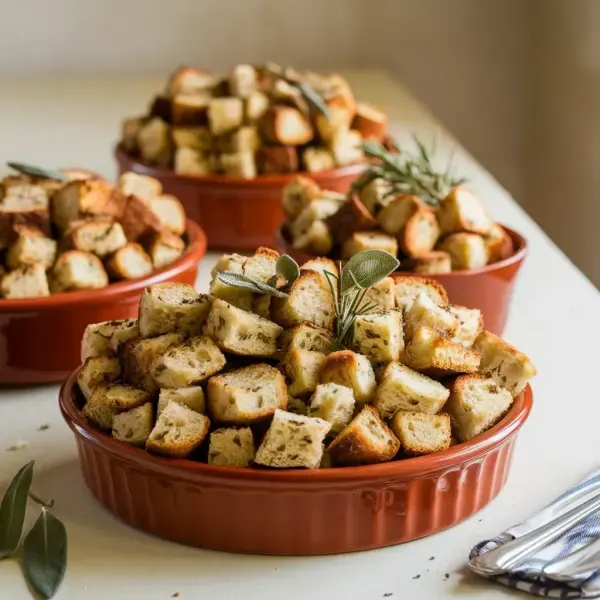 Preheat your oven to 350°F (180°C). In a large bowl, combine the diced rustic bread with the chopped fresh sage, fresh thyme leaves, and minced fresh rosemary. Add the garlic powder, olive oil or melted butter, sea salt, and black pepper to the bowl. Toss everything until each bread cube is evenly coated.